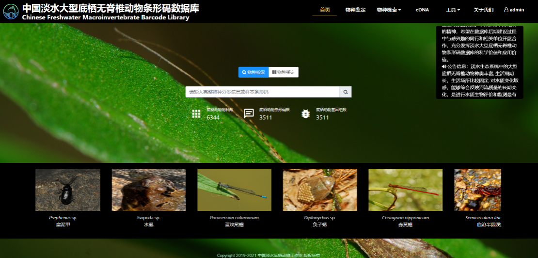 携手国内15个高校和科研院所研发的中国淡水大型底栖无脊椎动物条形码数据库,经过多年的数据积累、数据库功能开发和网络开放使用功能研发与优化后正式对外开放//cfmlib.gczp1.net/(数据库注册使用等事宜,请联系[email protected])。