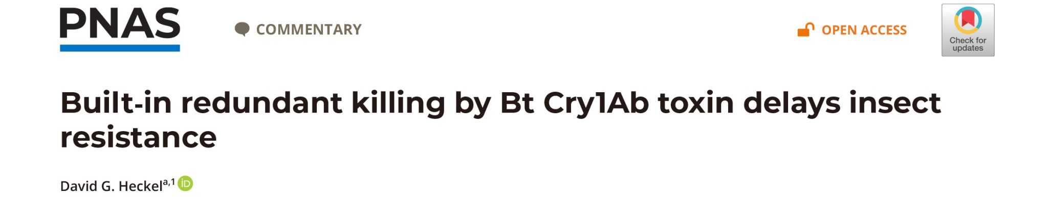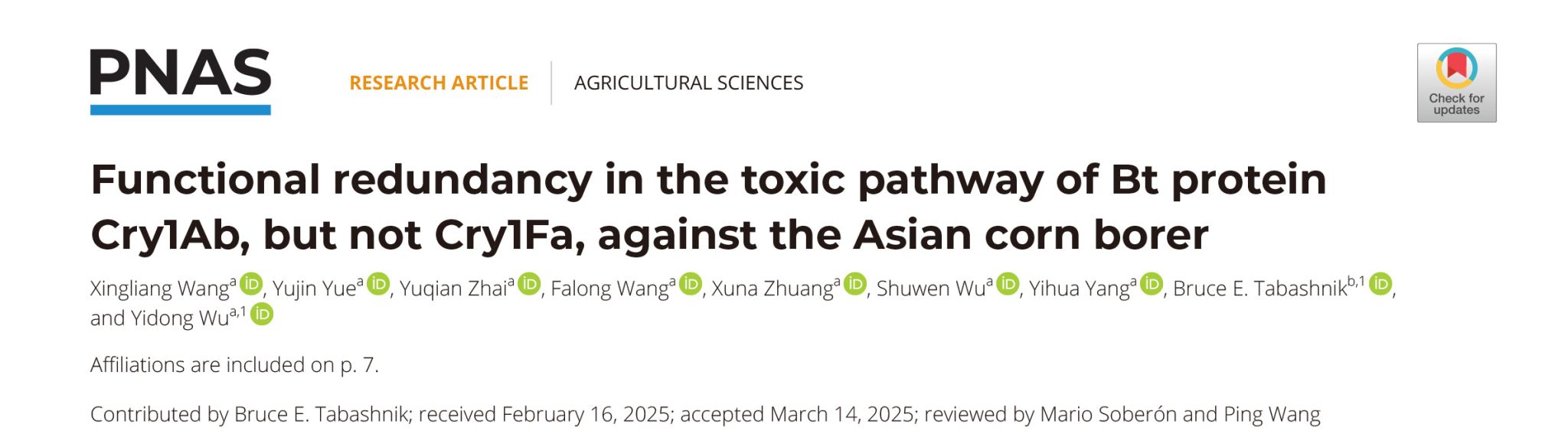 2025年6月9日,PNAS刊发了德国马克斯·普朗克化学生态学研究所David Heckel教授的评论文章“Built-in redundant killing by Bt Cry1Ab toxin delays insect resistance”,对该项研究成果的价值和意义给予高度评价。Heckel教授表示,Wang等的研究堪称技术创新的典范之作(tour-de-force),实现了离体和活体技术手段的有机结合。Cry1Ab这种天然的“双保险”机制有效延缓了害虫抗性的产生,对北美乃至全球利用Bt玉米持续防治玉米螟等靶标害虫具有重要启示。