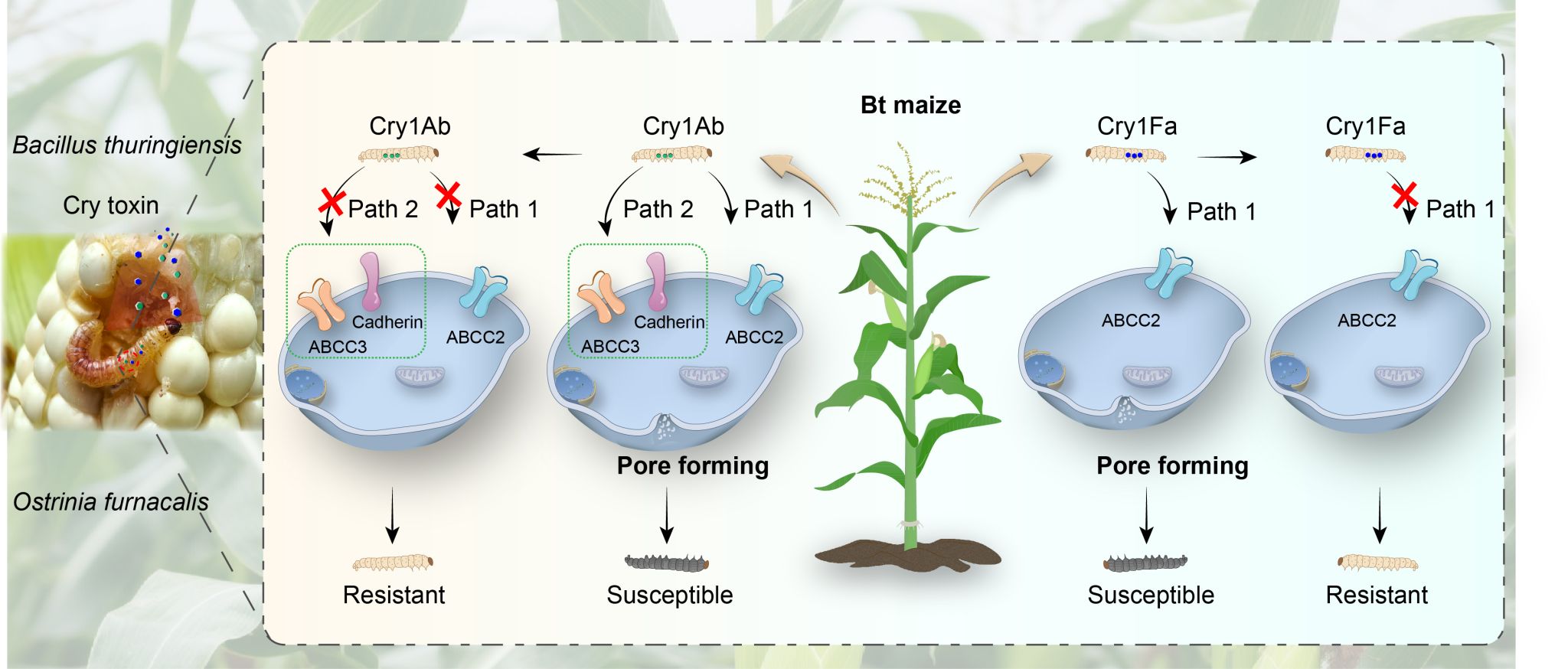 田间抗性监测数据显示,表达Cry1Fa的Bt玉米在加拿大种植12年后,欧洲玉米螟就产生了抗性;而表达Cry1Ab的Bt玉米在种植21年后仍对欧洲玉米螟保持优异防效。室内抗性筛选研究表明,玉米螟对Cry1Fa的抗性演化速度明显快于对Cry1Ab的抗性。本研究揭示了这一现象的奥秘:Cry1Fa因依赖单一杀虫通路,抗性风险较高;而Cry1Ab则具有两条冗余的杀虫通路,需要两种不同的受体同时突变才能产生抗性,从而显著降低了抗性风险。