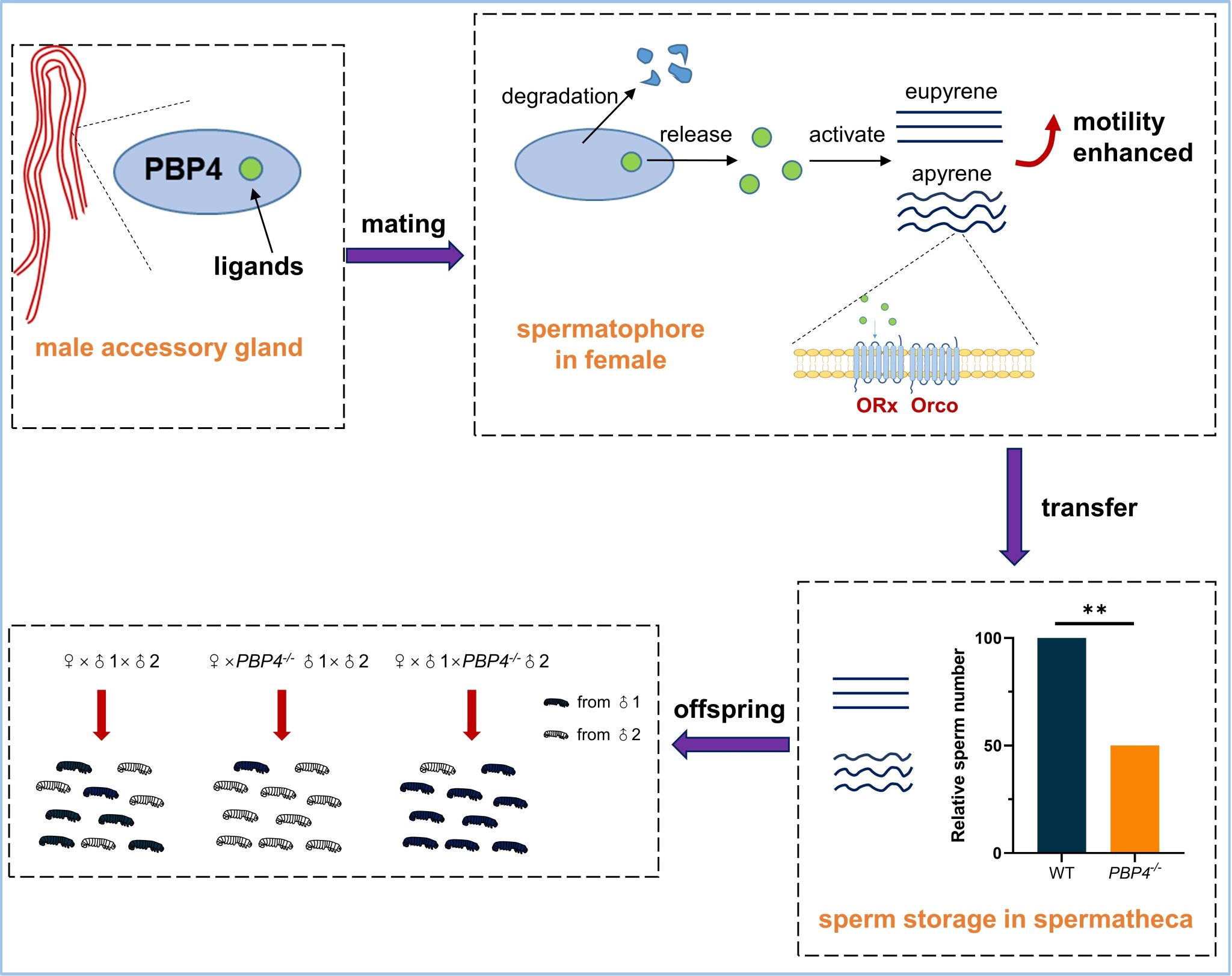 鉴于PBP等气味结合蛋白均通过对活性小分子化合物的结合或运输而发挥不同的功能,团队推测PBP4可能也结合特定的内源化合物并从雄性附腺运输至交配囊,然后激活精子表面的 ORx/Orco 阳离子通道,从而促进精子的运动。体外精子运动实验表明,相比于野生雄虫,PBP4敲除雄虫精液提取物显著降低了精子的运动能力;同时Orco的特异性激动剂VUAA1在不同浓度下均可促进野生及PBP4敲除雄虫精子的运动,但对Orco敲除雄虫的精子没有作用,初步证实了该推测。