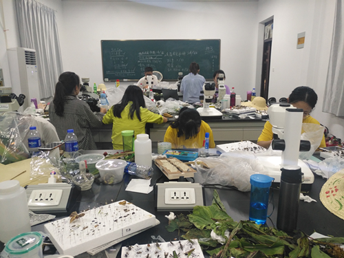 第二天,同学们迎着清晨的第一缕阳光,在几位老师的带领下前往稻田,实习正式拉开序幕。一部分同学穿上护具,拿着工具在水稻田中对病虫害情况进行细致的统查;另一部分同学则在田边收集各类昆虫和病叶标本。同学们在实验室利用解剖镜和显微镜等工具,通过查阅相关的资料,鉴定昆虫和病原物。组员和组间,分工明确,相互协作。