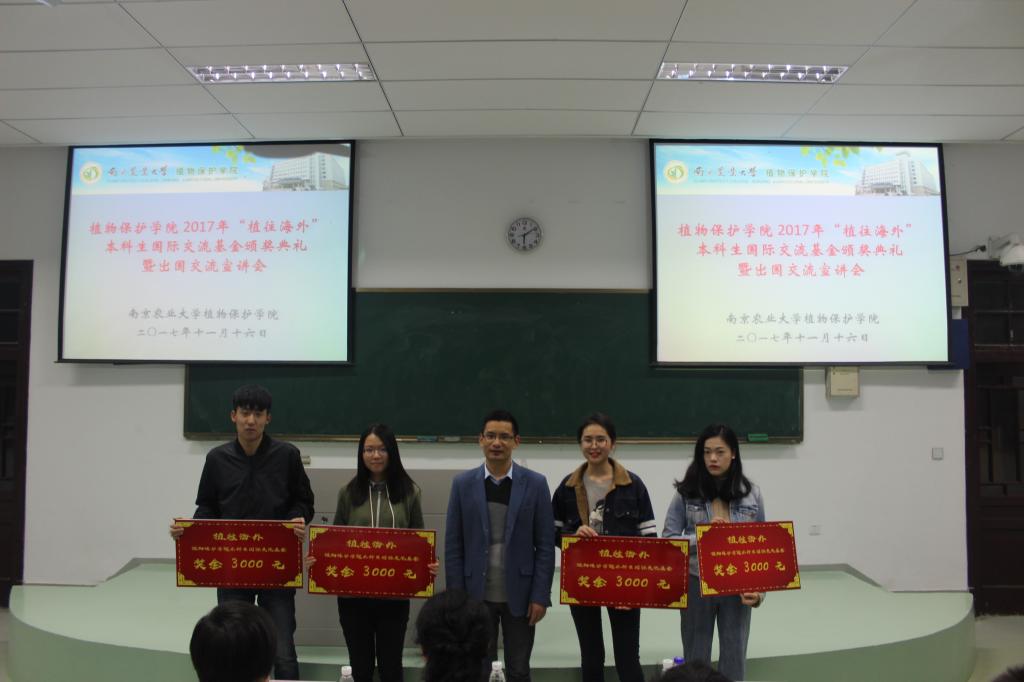于主楼143举办2017年“植往海外”本科生国际交流基金颁奖典礼暨出国交流宣讲会。本次到场的嘉宾有国教院副院长童敏、植保院党委副书记黄绍华、植保院09年优秀校友Wonder Education校长李珂,以及植保院的辅导员和部分本科生。