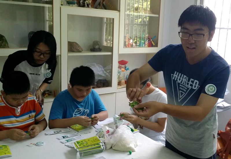 小朋友被分为两组交替学习农药残留检测和昆虫知识。在农药残留实验课上,植协志愿者利用手绘宣传册和精美的小书签,为小朋友简单介绍农残的危害,教授小朋友用农药速测卡检验果蔬上是否有农药残留以及残留量的多少。同时,志愿者采用身边易得的淘米水、苏打水等材料教授小朋友如何减少、去除农药残留。