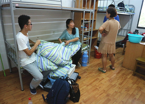 拖着沉重的行李的新生家长们,来回奔波于计财处、大活缴费处以及玉兰路之间,为孩子们的入学报到而费心尽力。骄阳虽然能洒在他们身上,但他们心底对孩子的爱犹如一股清泉,滋润心田。在把蚊帐、被褥都安排妥当后,新生家长还不忘向志愿者们询问学校和学院的基本情况,来自五湖四海的家长们带着不同的口音却聊着同样的话题,唯父母之心天下最可贵也。