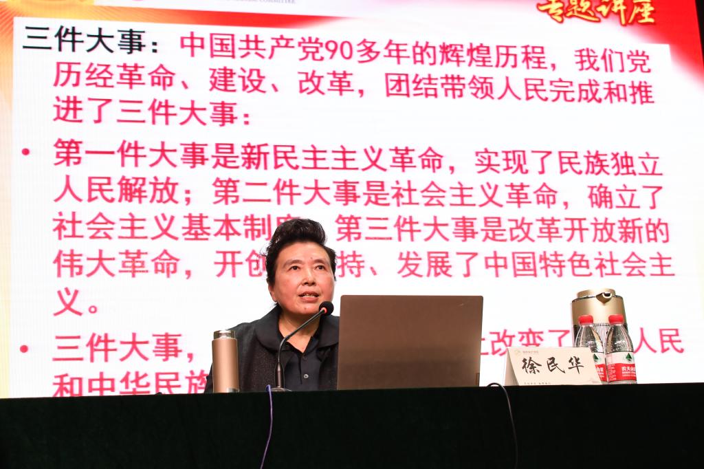 徐民华按照问答逻辑,从理论渊源、历史渊源、现实要求和实践要求四个维度,提出“中国共产党的历史使命是什么”“新时代中国共产党的历史使命是什么”“习近平总书记为什么在十八大以来反复强调初心和使命问题并在全党部署主题教育”“新时代我们党在履行使命方面存在哪些措施”“新时代中国共产党人如何履行使命、对党员领导干部有哪些实践要求”五大问题,全面阐释了新时代中国共产党的历史使命。报告强调,中国共产党是使命型政党,其指导思想是马克思主义,价值宗旨是人民利益至上,民族使命是实现自身民族、国家的解放与发展,阶级使命是实现共产主义、实现每一个人的自由全面发展,中国共产党具有强烈的历史主体意识、舍我其谁的担当情怀、勇于牺牲的奋斗精神。在机遇与挑战并存的新时代,中国共产党的历史使命是为中国人民谋幸福,为中华民族谋复兴,只有“不忘初心、牢记使命”,才能成功回应中国现代化进程中的机遇和挑战、成为中国人民的坚强领导核心。徐民华希望在座师生深入学习和贯彻习近平新时代中国特色社会主义思想,深刻领会新时代中国共产党历史使命的内涵和要求,充分认识党的建设性伟大工程的长期性、复杂性、艰巨性,不忘初心、牢记使命,坚定“四个自信”,自觉为担当新时代的伟大使命,实现中华民族伟大复兴的中国梦不懈奋斗。