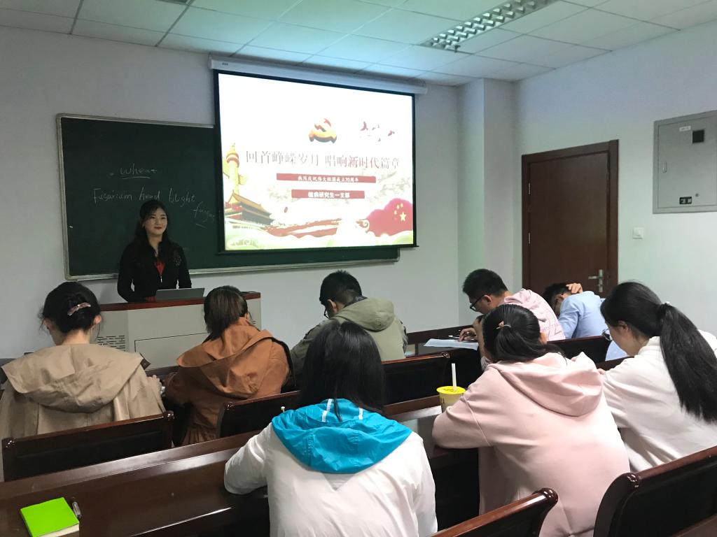 植物病理学系研究生第一党支部召开“回首峥嵘岁月,唱响新时代篇章”专题学习活动。支部书记王燕老师担任主持人,党小组组长任元同志汇报学习内容,全体成员共同参与。