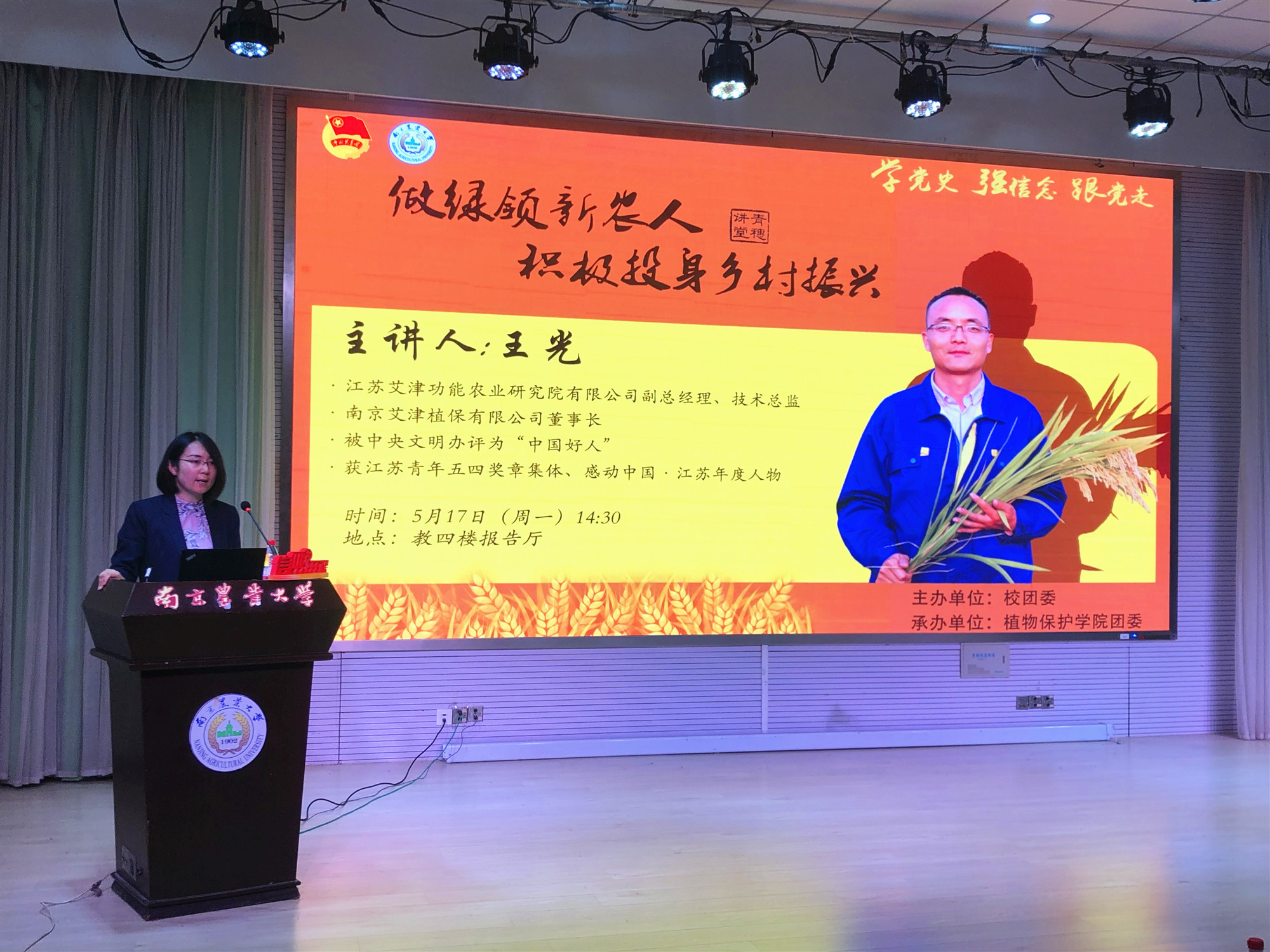 5月17日下午,江苏艾津功能农业研究院有限公司副总经理、技术总监,南京艾津植保有限公司董事长王光做客我校第40期青穗讲堂,带来以“做绿领新农人,积极投身乡村振兴”为主题的分享。本次活动由校团委主办,国产自拍