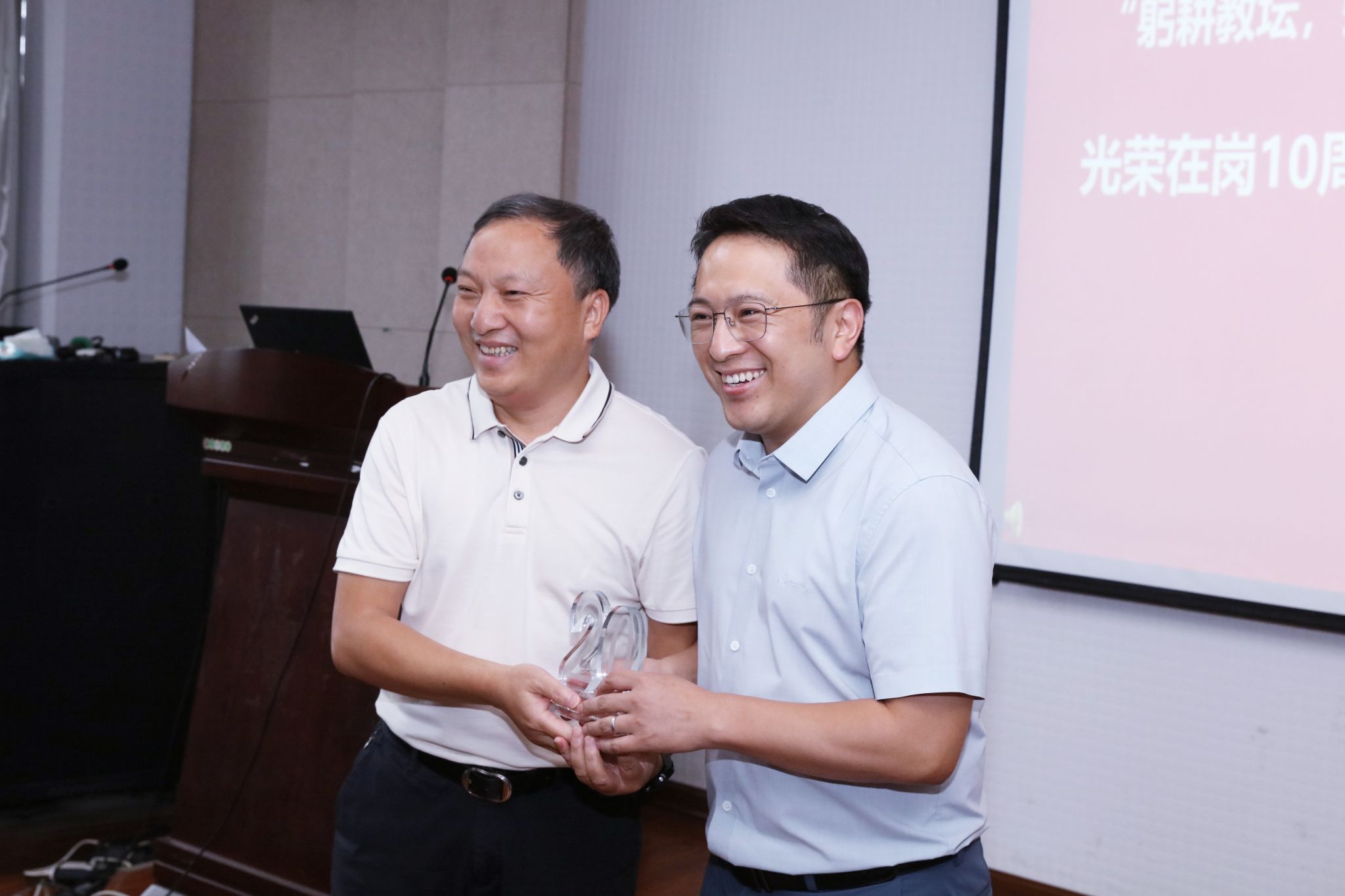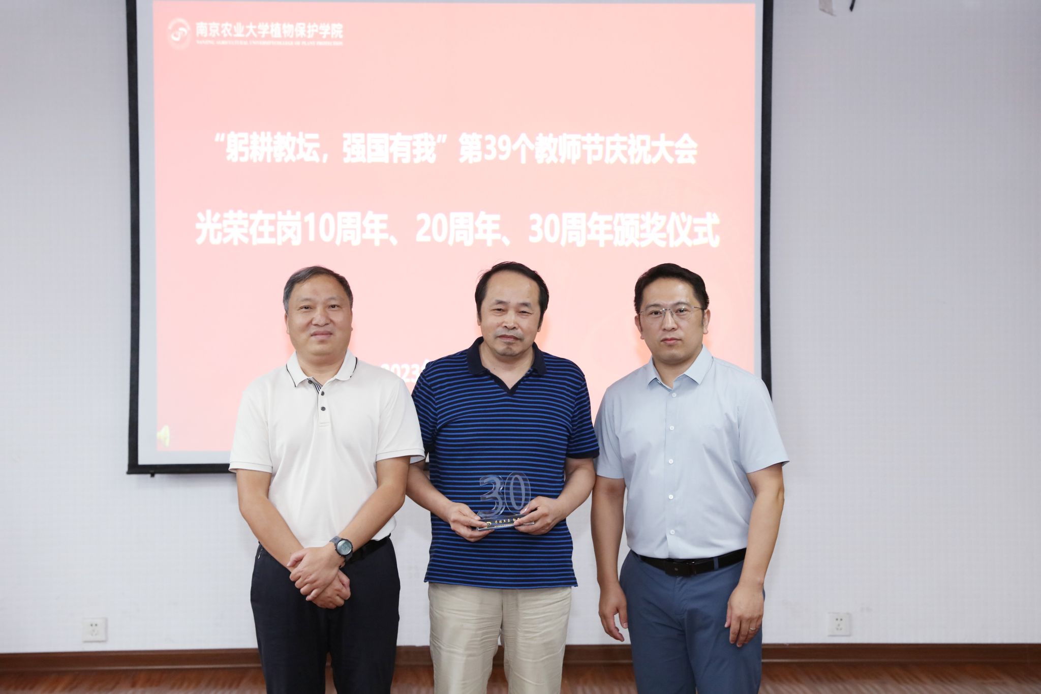 学院院长张正光为光荣在岗10周年的王兴亮、叶文武、吴顺凡等老师,在岗20周年的邵刚老师,在岗30周年的李国清老师颁发了纪念奖杯,5位老师分享工作感悟。