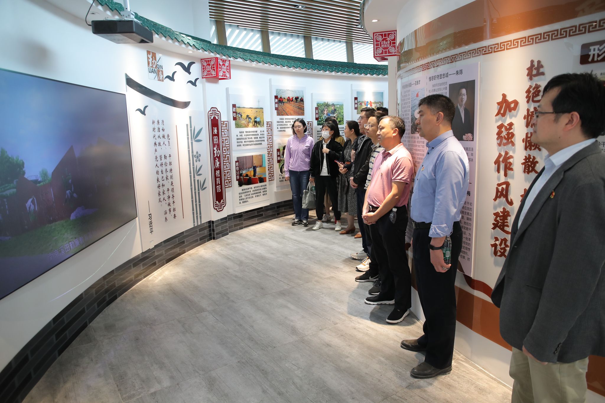 溪田勤廉教育基地位于江宁区横溪街道西岗社区溪田田园综合体内,基地将生态环境、农耕文化、红色资源与廉政文化有机融合,打造了“一点连四团”组合式教育阵地。在勤廉教育馆内,通过文字、图片、漫画、故事等形式,展示了党和国家领导人重要讲话、反“四风”金句、反“四风”漫画,江宁廉吏故事及新四军艰苦奋斗的历史等内容,教育引导广大党员干部不忘初心,继承和发扬党的优良传统和作风,深刻领悟老一辈革命家勤俭持家的高尚品格。在廉政馆,全体党员们一起观看了微电影《廉政中国》,通过以案说纪、以案说法、以案说责,推动党员干部引以为戒、醒悟知止,强化底线思维,切实做到防微杜渐、警钟长鸣。