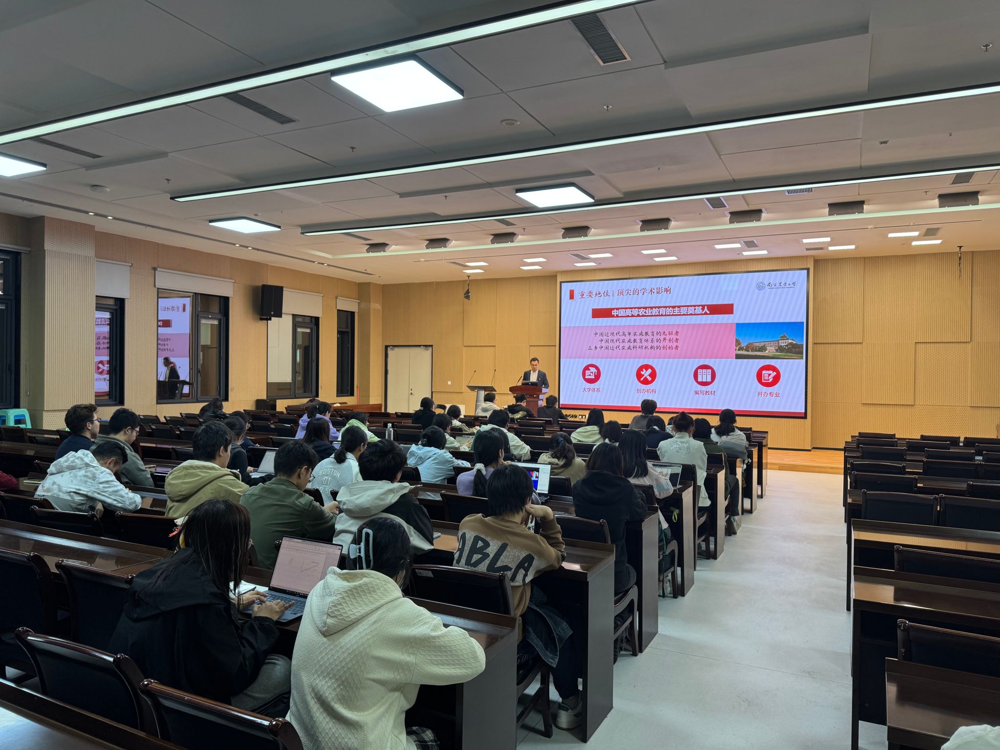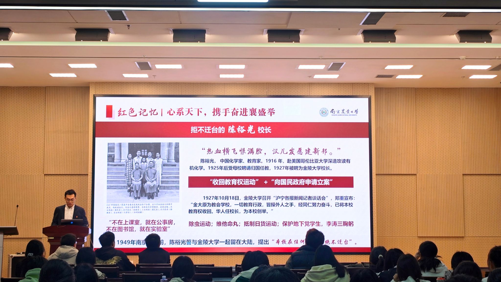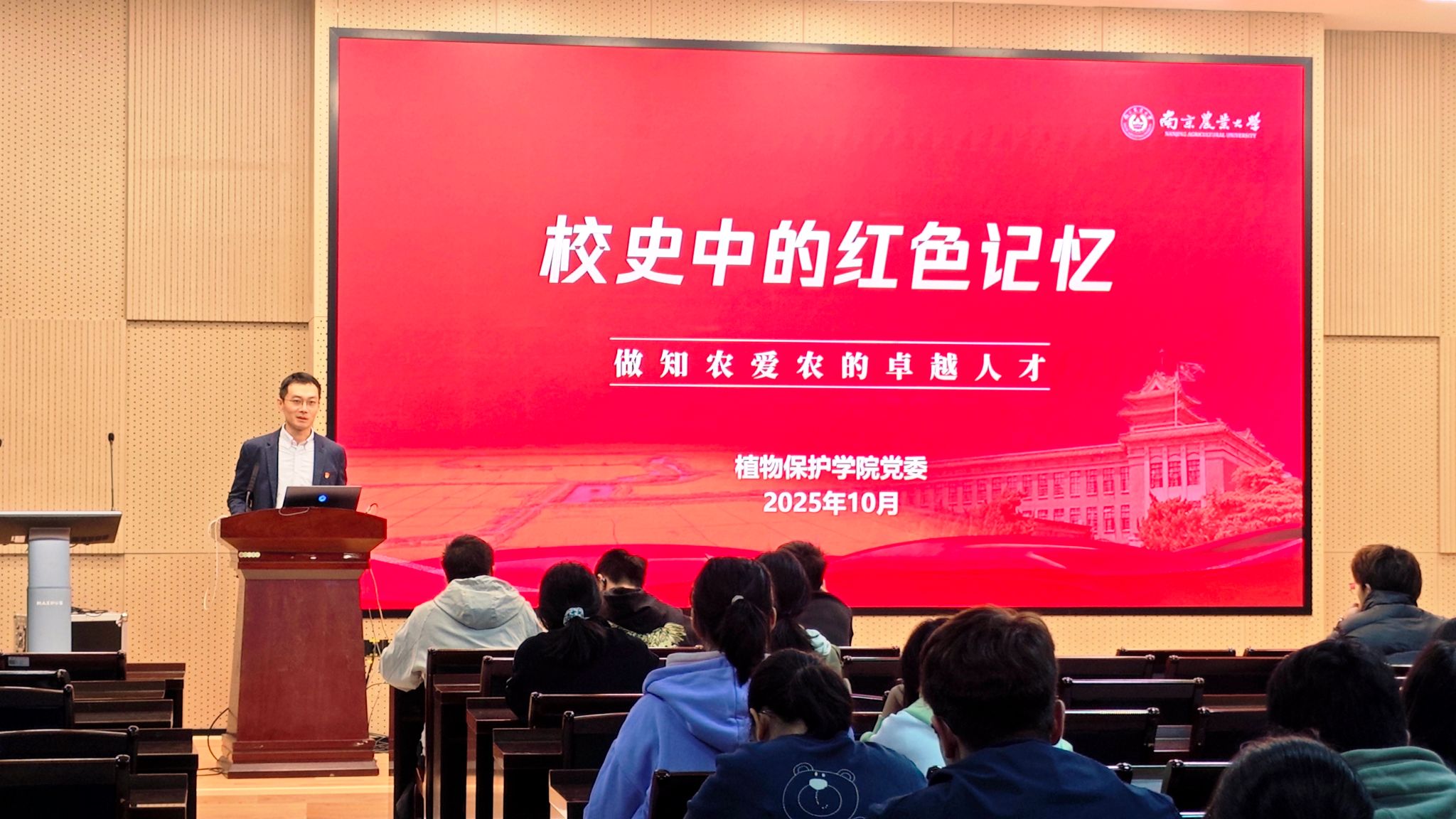 陈志亮以《校史中的红色记忆》为题讲述如何做一个知农爱农的卓越人才。他带领学员们回顾了学校波澜壮阔的发展历程,通过讲述拒不迁台的陈裕光校长、远牧昆仑的盛彤笙院士、三次科考罗布泊的彭加木先生等先辈的感人事迹,深刻诠释了“诚朴勤仁”的南农精神。此外,他还列举了以钱崇澍、秉志等为代表的一批学术大师,他们作为我国植物学、动物学等领域的奠基人与开拓者,创造了卓越的学术成就。陈志亮勉励全体学员,要以这些前辈为榜样,从红色校史中汲取力量,努力成长为知农爱农的新型卓越人才。