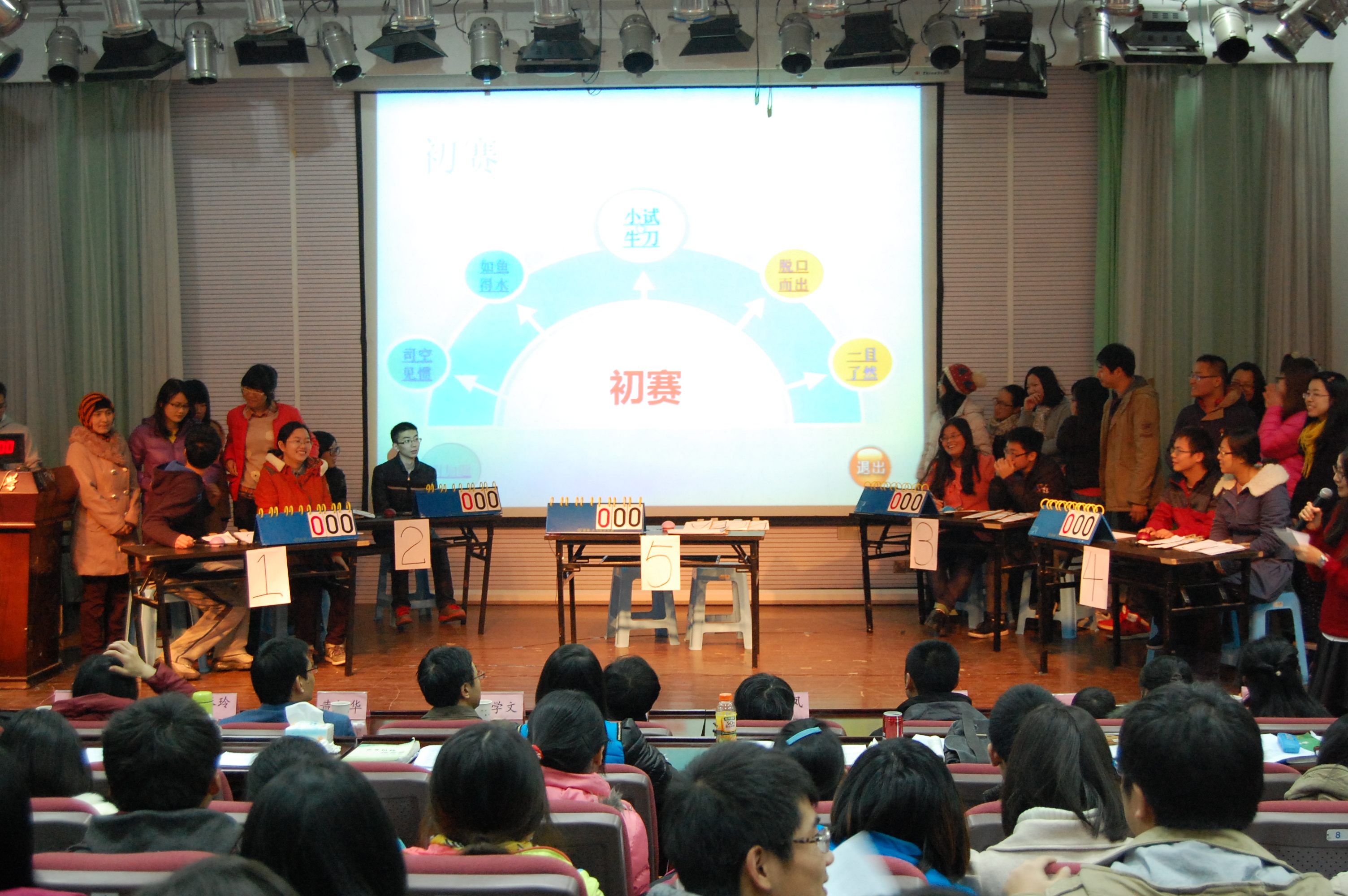 此次竞赛分为初赛,决赛,擂台赛三个阶段。初赛以班级为单位按小试牛刀,如鱼得水,一目了然,脱口而出,司空见惯五轮进行角逐,最终,来自121班的一、二、三组,122班的五组,133班的四组脱颖而出,冲入决赛。决赛过程紧张激烈,起先四组以220分遥遥领先,在风险题中获得优先选题的权利,却在20分的风险题中失误,给了三组迎头赶上的机会。而三组保守地选择了20分的风险题并顺利答对,与四组比分追平,并最终在加题赛中反超四组获得冠军。