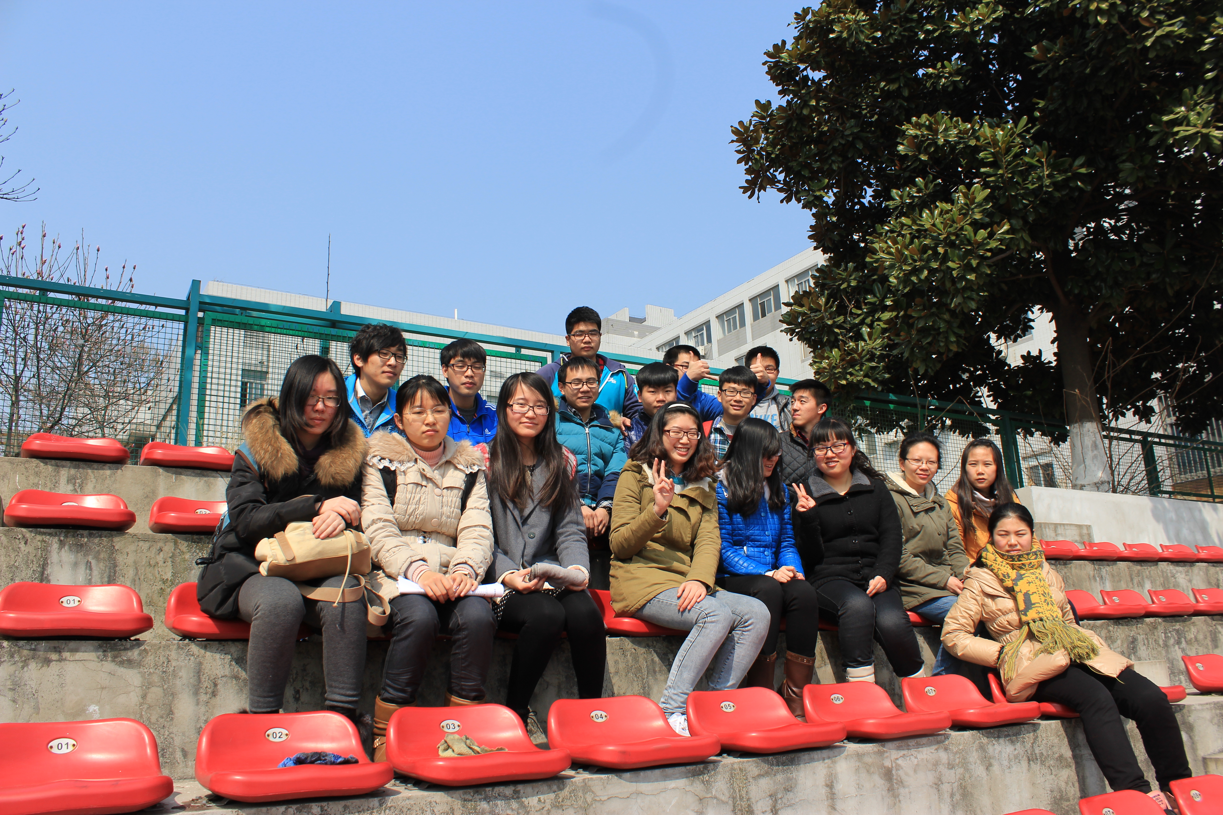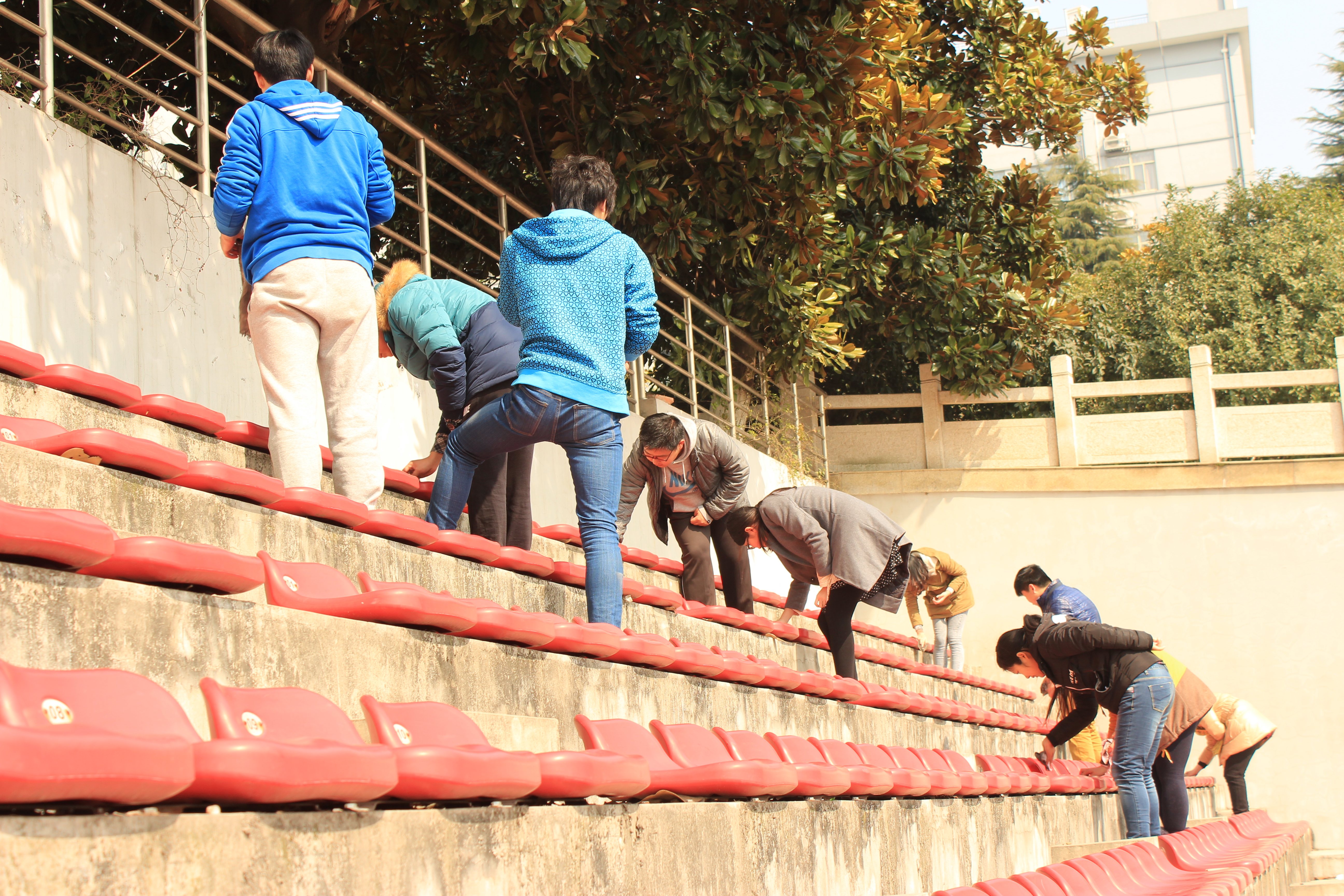 经历两节紧张的课程之后,同学们回到宿舍拿了清理工具共同奔向操场,经过班长的明确分工,在主席台两旁的看台开始了繁忙但是愉快的工作。投入战斗的同学们认真清理着满是灰尘的座椅,旁边负责打水清理的同学们穿梭往来,为大家做好后勤工作。天气晴朗,但初春的空气中还有微微的寒意,然而同学们互帮互助,热火朝天的义务劳动使大家心中充满温暖。经过近一个小时的工作,看台的所有座椅都被同学们清理完毕。不久,便有人在看台的座椅上开始读书,同学们的劳动成果得到肯定,大家心情都十分愉悦。班级同学进行合影留念之后,本次活动顺利结束。