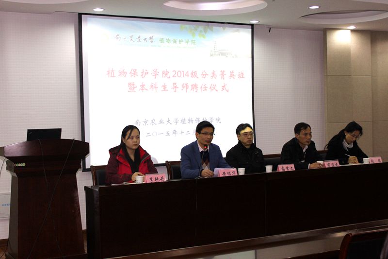 2015年12月10日下午,植保院于理科楼C404举行2014级分类菁英班开班暨本科生导师聘任仪式。活动由本科生辅导员李艳丹主持,学院党委副书记黄绍华、副院长高学文、导师代表窦道龙、教学秘书张聪出席,学院2014级全体本科生参加。