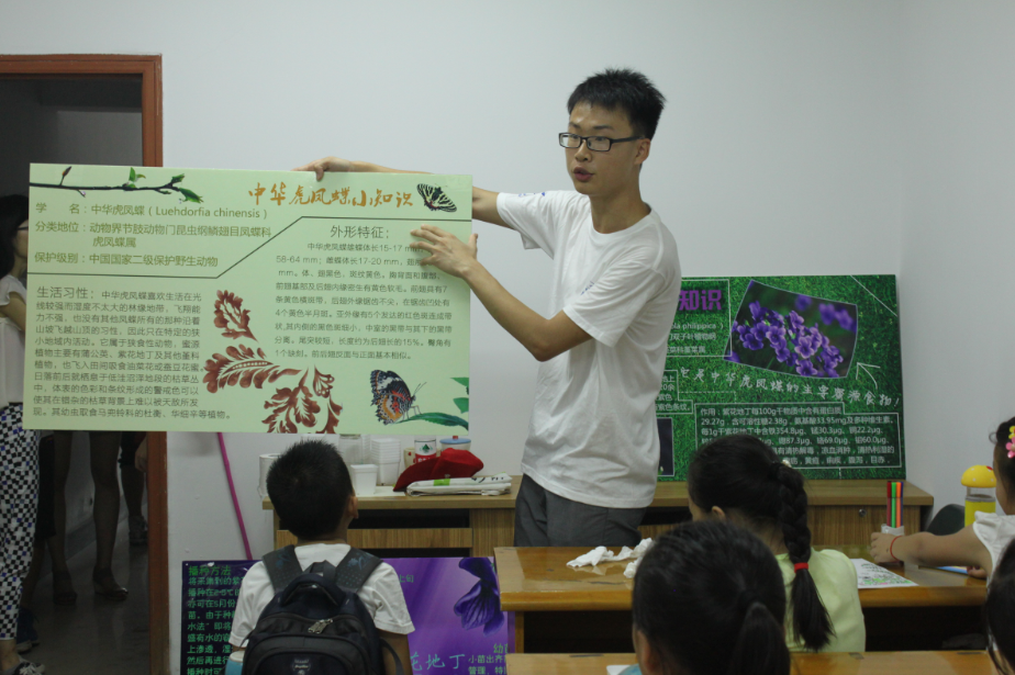 此行,植保院“中华虎凤蝶护卫队”实践团的同学还给高家库社区夏令营的孩子们带去了一堂别开生面的“护蝶课”。课上,志愿者向孩子们重点介绍了国家二级保护动物——中华虎凤蝶的生活习性和生存现状,并给孩子们发放中华虎凤蝶蜜源植物——紫花地丁的种子,教授其种植方法,呼吁孩子们以实际行动来保护中华虎凤蝶。活动过程中,孩子们对虎凤蝶表现出了极大的兴趣和求知欲,纷纷举起小手提问。南农的同学们亦用通俗易懂的言语一一进行了解答。