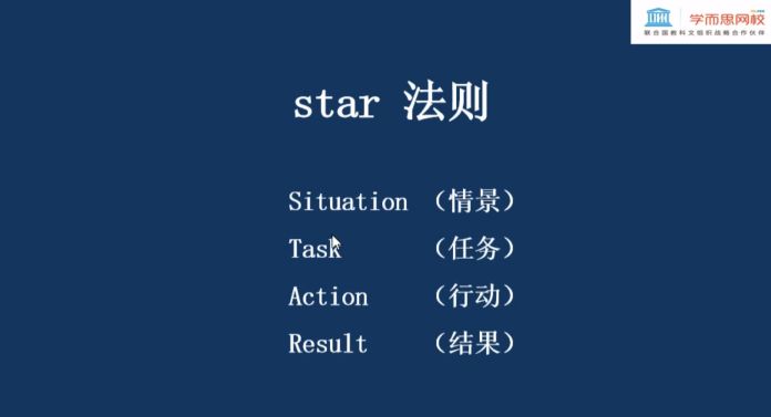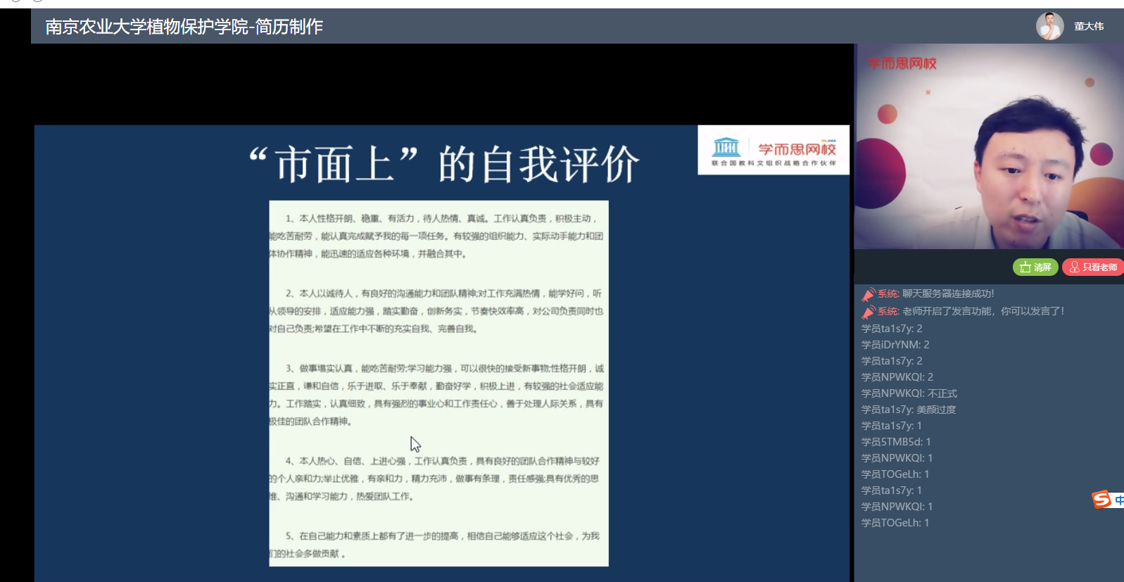 董老师分别从基本信息、教育背景、个人经历、个人技能和自我评价五个模块,对如何写好个人简历进行了具体的培训。他以实用为出发点,详细介绍了简历制作中的“STAR”法则,并通过罗列撰写简历时可能会犯的错误,对比一些优秀简历作为范例,提出了指导性建议,使得在线观看的同学们受益匪浅。