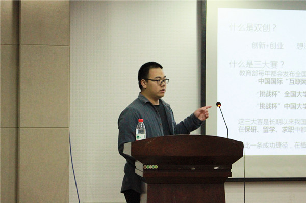 杨纪潇从自身经历入手,层层递进,作了关于“互联网+”、“挑战杯”等创新创业大赛经验的分享。他指出,“双创”即“创新+创业”,参与“双创”可以通过参加 “互联网+”大学生创新创业大赛、“挑战杯”全国大学生课外学术科技作品竞赛和“挑战杯”中国大学生创业计划大赛的“三大赛”方式。创业之路中,创意想法是挑战底色,脚踏实地是奋斗关键。杨纪潇详细介绍了三大赛的比赛时间、参赛组别、具体流程和奖项设置等。三大赛的意义绝不仅仅是保研、考研加分的冰冷冷数字,更是补足社会盲区、积累社会经验的绝佳练兵场。市场调研是前提,创意思维是开篇,构建创业计划书则是将脑中万千山河落于实际的万里长征第一步。如何做出有实际意义和价值的课题、如何落落大方地演讲路演PPT,杨纪潇展示了创新创业竞赛的一些具体技巧和功能性准备。同时强调,要针对自己的生涯规划和自我能力测评,因地制宜因材施教采取相应的行动,才能筑梦蓝图、构建梦想。