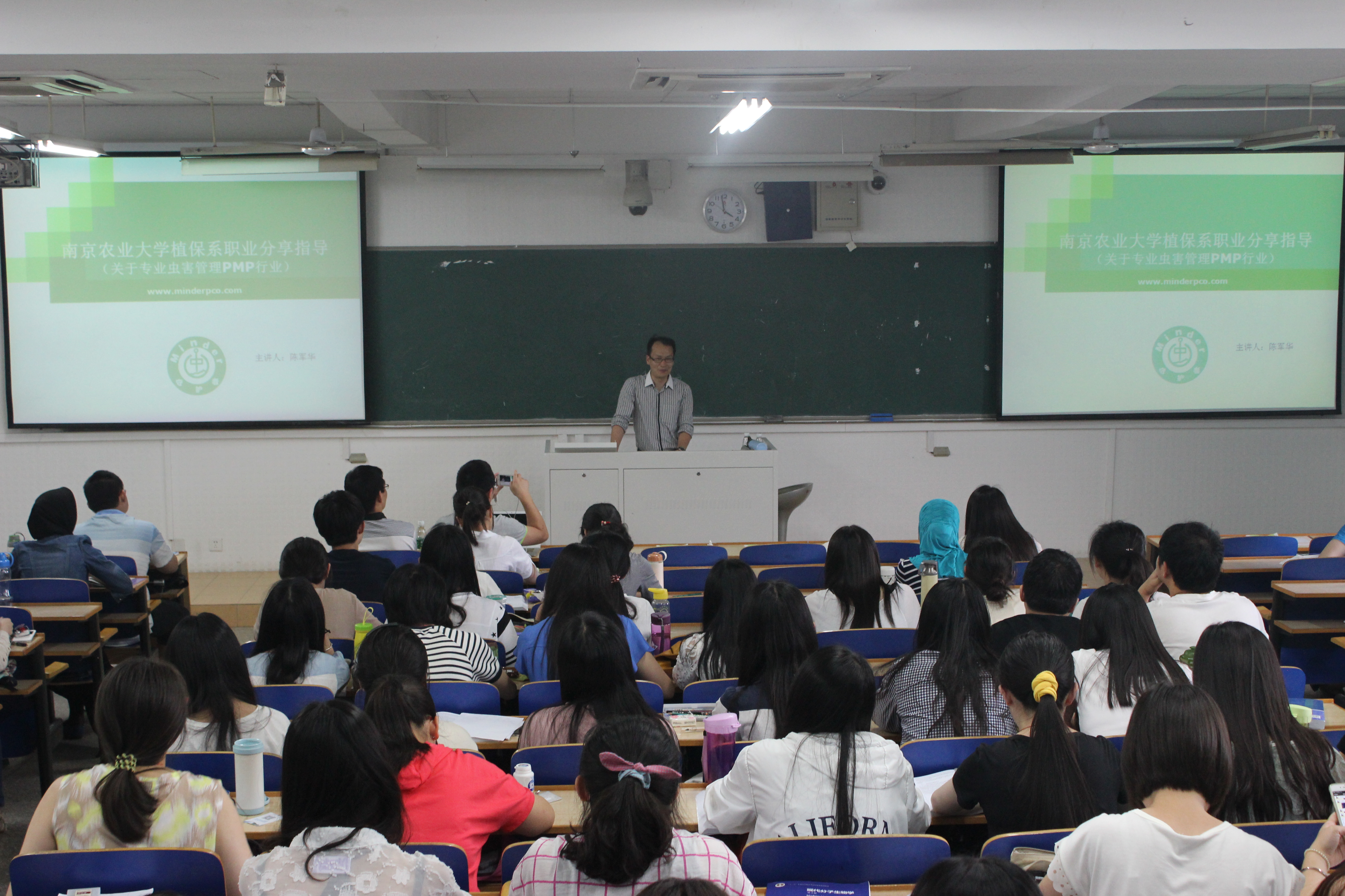讲座伊始,黄绍华向观众隆重介绍特约植保优秀校友——上海闽泰环境卫生服务有限公司总经理陈军华。在热烈的掌声下,陈军华结合自身有关昆虫防治的丰富经历、对比中国和美国有关虫控服务业的发展和温馨建议三个方面对大三学生就业进行指导。
