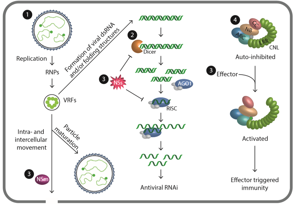植物病毒基因组仅编码少数几个蛋白,它们必需依赖于寄主植物才能完成自身的侵染和增殖。因此植物病毒大多通过其编码的蛋白来劫持或者利用寄主因子来实现自身的复制、转录、移动和粒体的组装等生命过程。与此同时,寄主植物在感知病毒的种种入侵性行为后,则会启动自身的防御体系来抵抗病毒的侵染。于是便上演了一场植物与病毒之间为了各自生存而战的博弈。