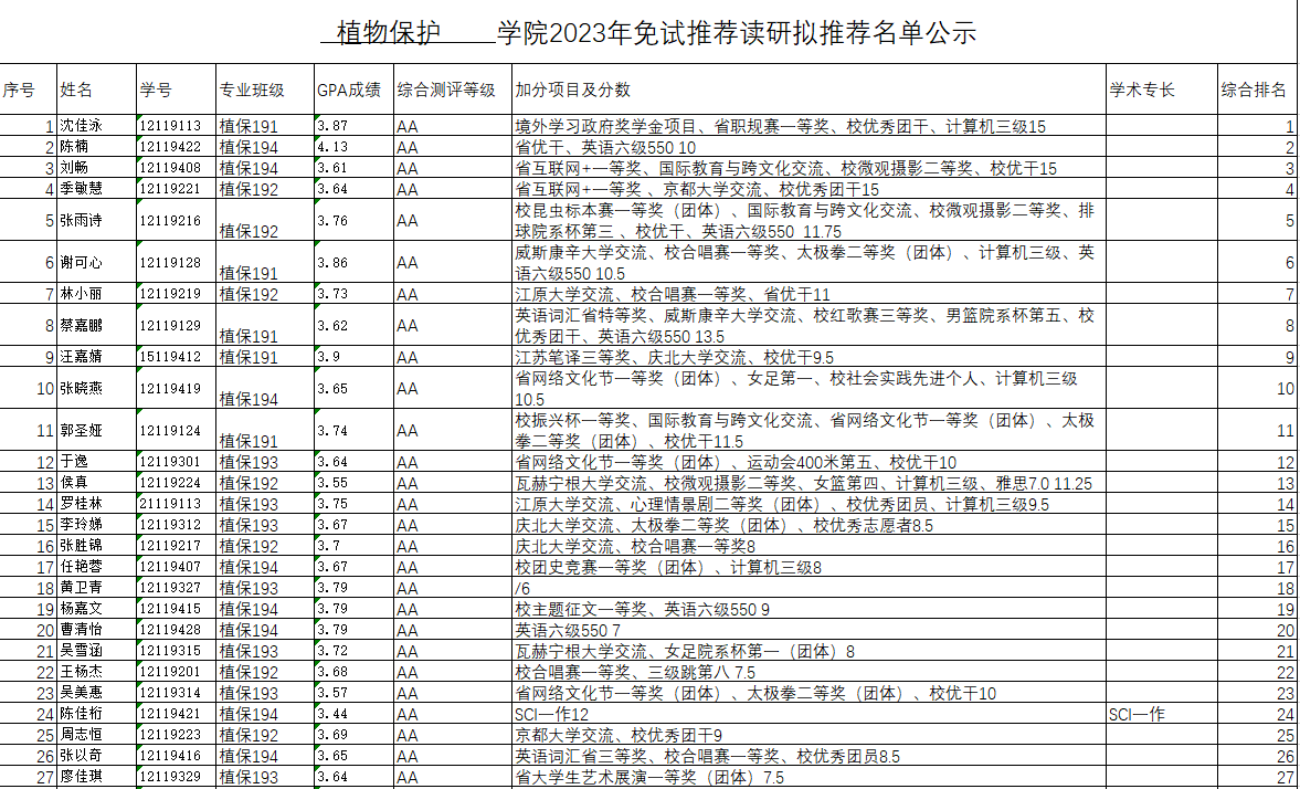 根据《国产自拍 关于做好2023年推荐优秀应届本科毕业生免试攻读研究生推荐工作的通知》文件精神,经学生自愿申请,学院初步审核以及资格认定答辩,依据《国产自拍 2023年推荐免试研究生(含“直博生”)工作方案》综合排名,现将最终拟推荐名单公示如下(按综合成绩排名排序):